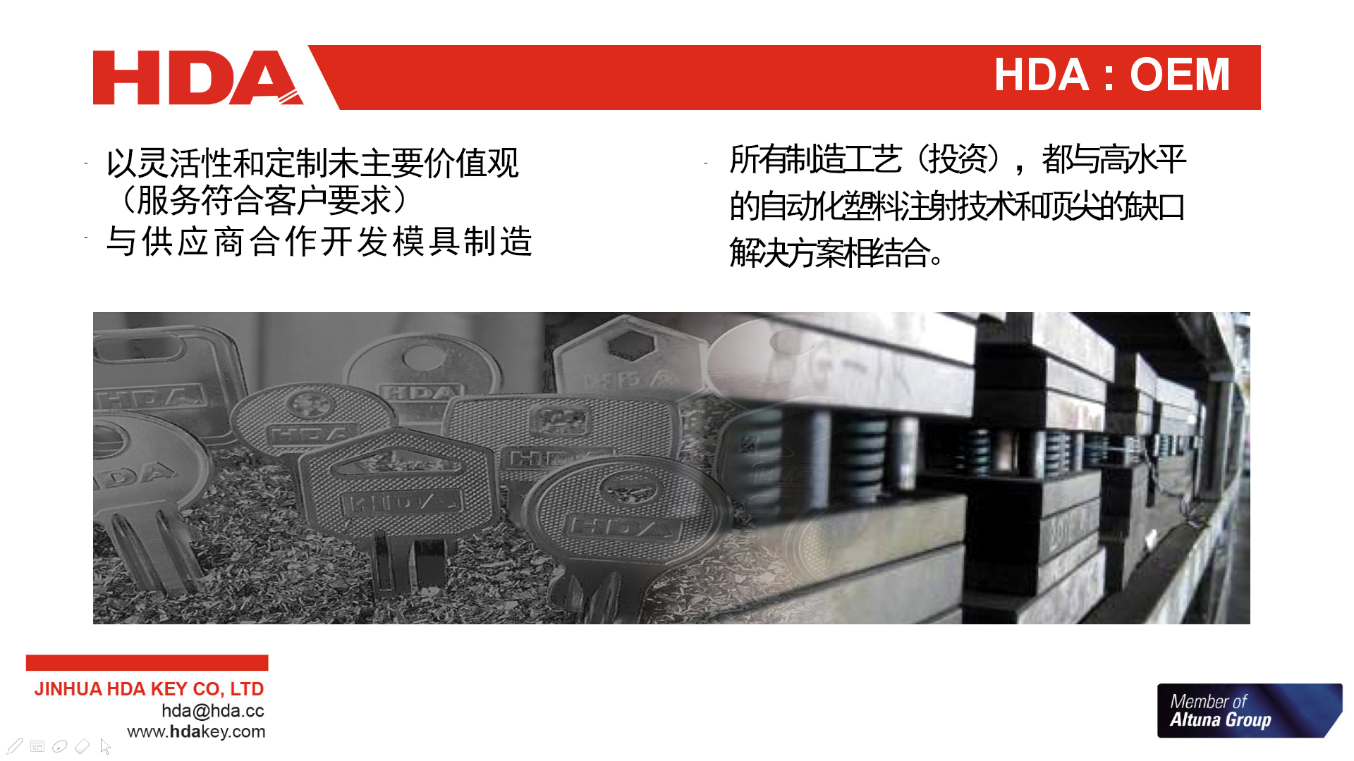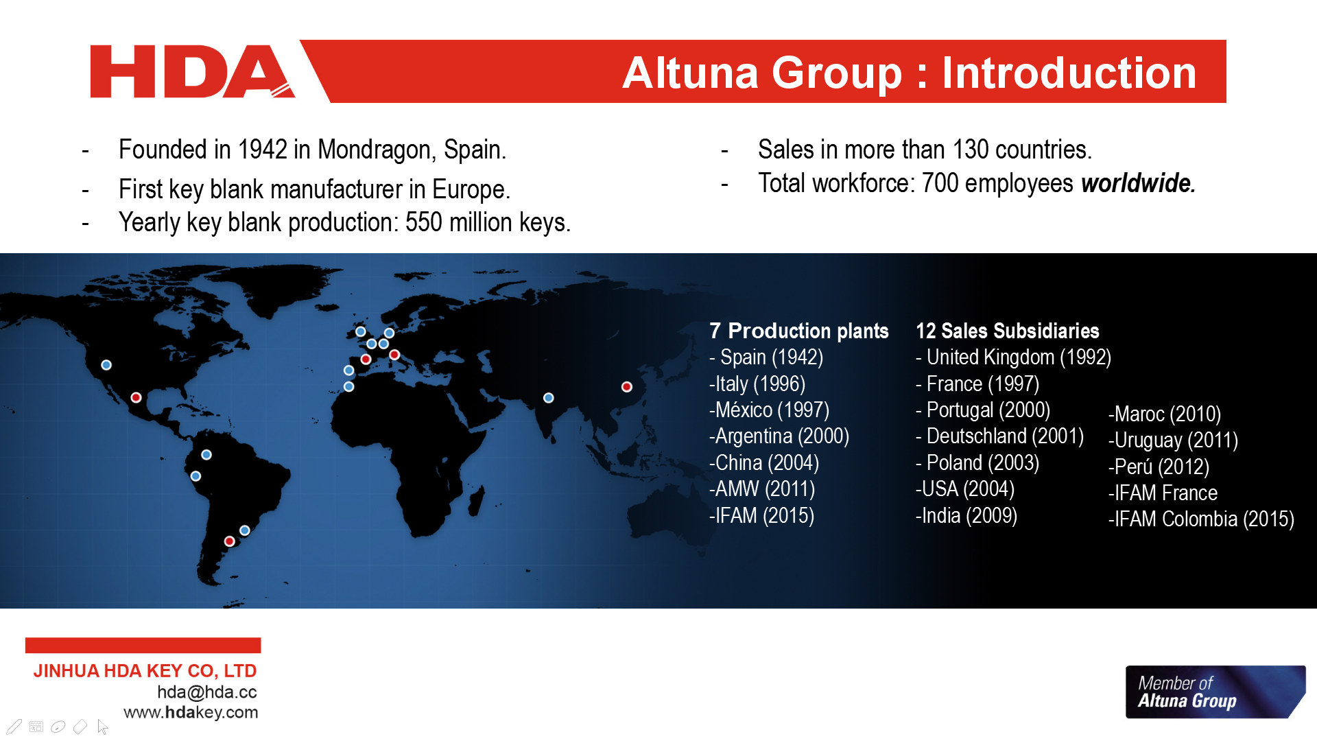 2005年,與歐洲三大鑰匙坯生產(chǎn)企業(yè)之一的西班牙JMA集團成立合資公司--金華HDA鑰匙有限公司。 2007年,轉為西班牙JMA集團獨資子公司。